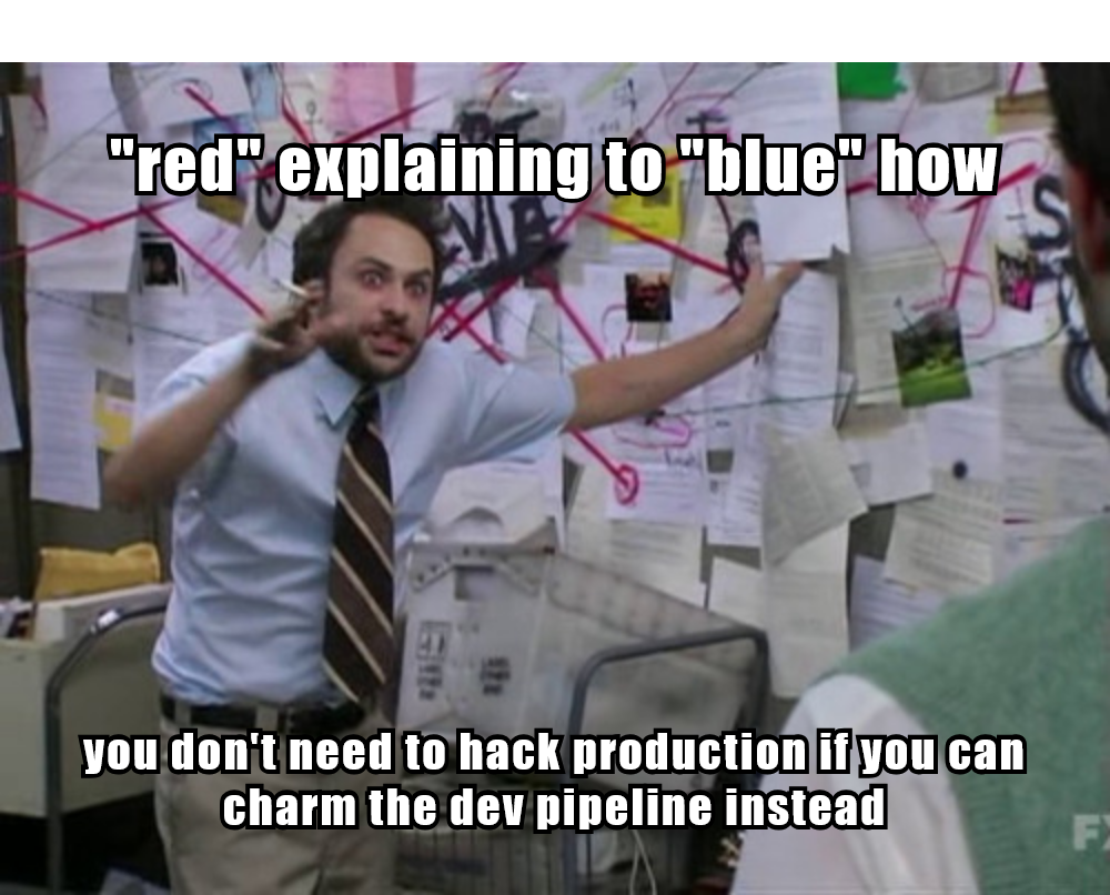 Think Red (Douglas McKee): I would target dev environments where integrity controls are weakest. Inject a signed but malicious DLL through a build dependency or public repo and let the pipeline do the rest. That is how you end up with production signing keys and OAuth tokens without touching a production host directly.